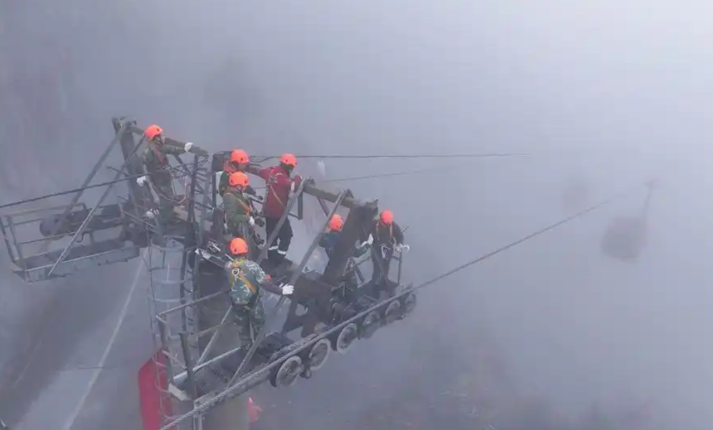 3月4日,張家界天門山索道在濃霧籠罩的環(huán)境中開展了一場緊張而有序的救援演練,模擬在懸崖絕壁間營救被困轎廂游客的情景。