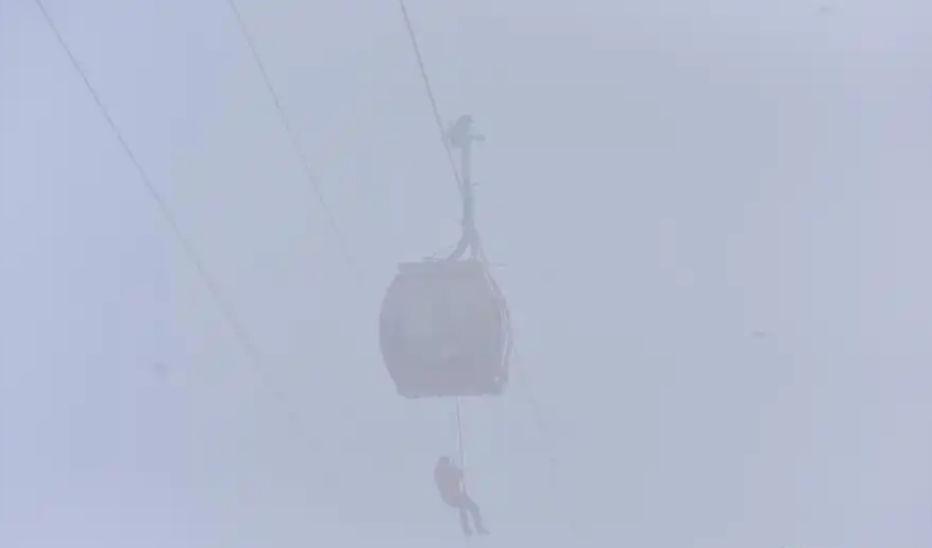 攜帶救援設備的數(shù)名專業(yè)索道救護人員迅速行動,攀上支架,在濃霧中以最快的時間抵達被困轎廂。他們將游客救助至安全地點,地面等候的醫(yī)護人員則第一時間對游客進行救護和安撫工作。