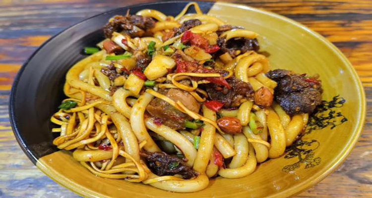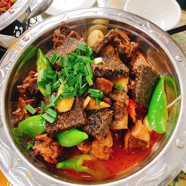 洪江血粑鴨是湘西極具代表性的一道菜肴,味道濃郁,美味獨(dú)特。把鴨肉放入到油鍋中,加入干辣椒、生姜、調(diào)味食材、糯米等一起翻炒,把鴨肉炸出油后倒入清水和鴨血小火燜煮,直至鴨肉酥爛。嘗上一口滿嘴油香,鴨肉酥爛入味,鮮味十足,極具風(fēng)味。