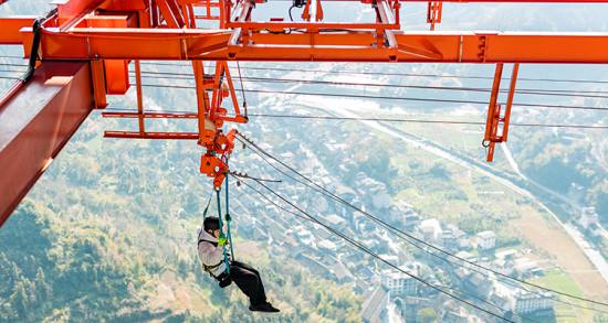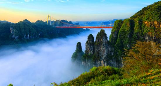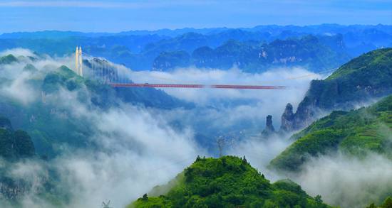 矮寨大橋飛越在德夯峽谷之巔,是世界跨峽谷跨徑最大的鋼桁梁懸索橋,大橋跨徑1176米,橋面距離峽谷底部355米。2007年10月開始修建,2012年3月建成通車,總造價(jià)15億元。大橋以克服了五大“世界級”施工難題和創(chuàng)造了四項(xiàng)“世界第一” 的高科技含量享譽(yù)中外,被贊為橋梁建筑藝術(shù)和自然景觀完美結(jié)合的典范。矮寨大橋不只是連接湘渝的重要交通設(shè)施,更是湘西的標(biāo)志性景點(diǎn)。