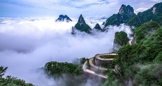 天門山盤山公路全長 10.77公里,高差 1300多米,共有99道彎,因直達天門洞而得名“通天大道”。大道兩側(cè)空谷幽深,借山勢層層疊起,如巨龍盤旋,直通天際,被譽稱為 “天下第一公路奇觀”。