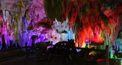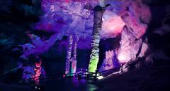 更絕的是,鵝管和鐘乳石倒映在水中,上下映照、渾然一體、形成了一座五光十色的巨大金山,光芒四射、龍鱗點點。她離奇多變的光影、五彩繽紛的顏色、千姿百態(tài)的形狀、加上水滴池面、洞中的天籟之音,形成了神秘之境讓你感到撲朔迷離,如在夢中、疑似天堂。當您走近她時,就體會到什么是人間仙境,什么是滄海桑田;當您聆聽她時,就知道什么是余音繞梁,什么是仙樂飄飄。那感覺、那韻味豈是語言能描述出來的。